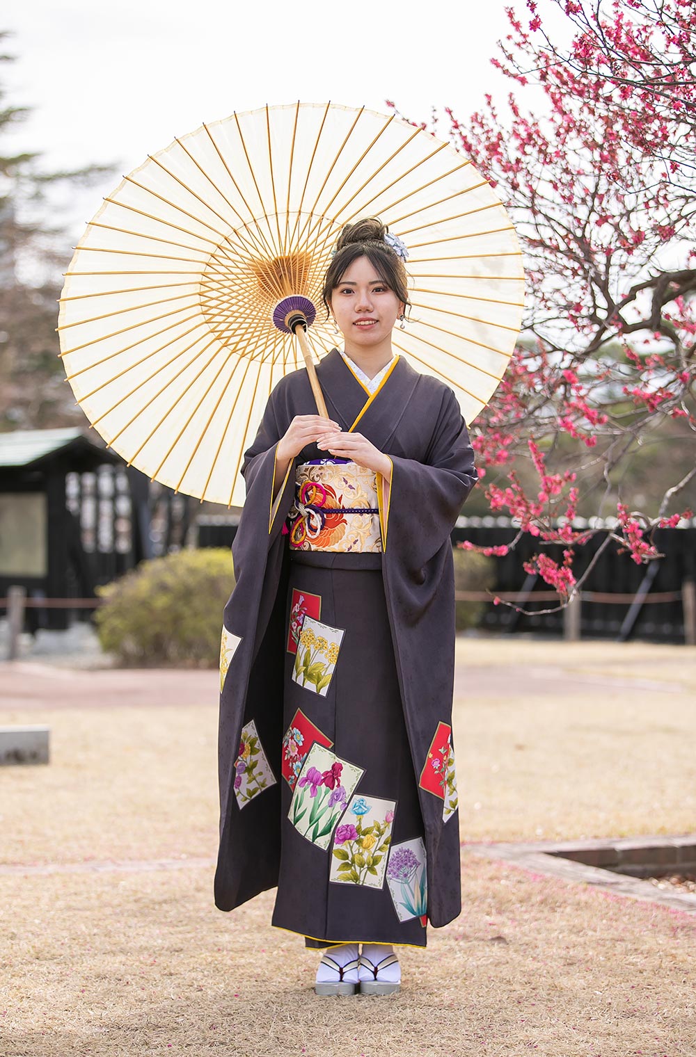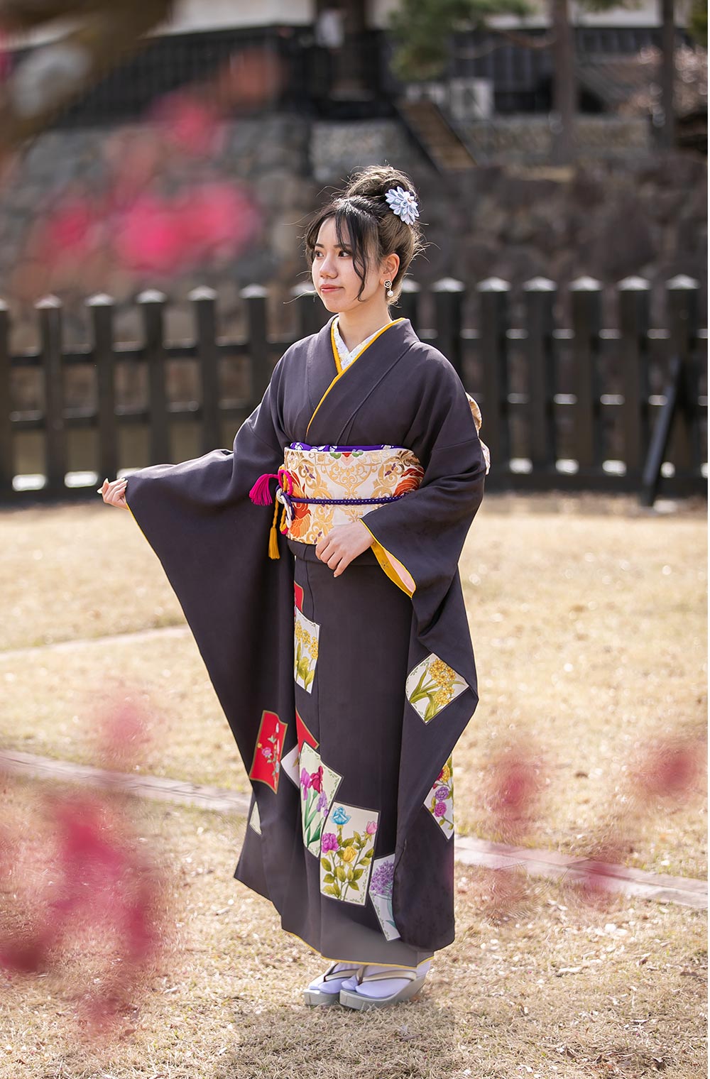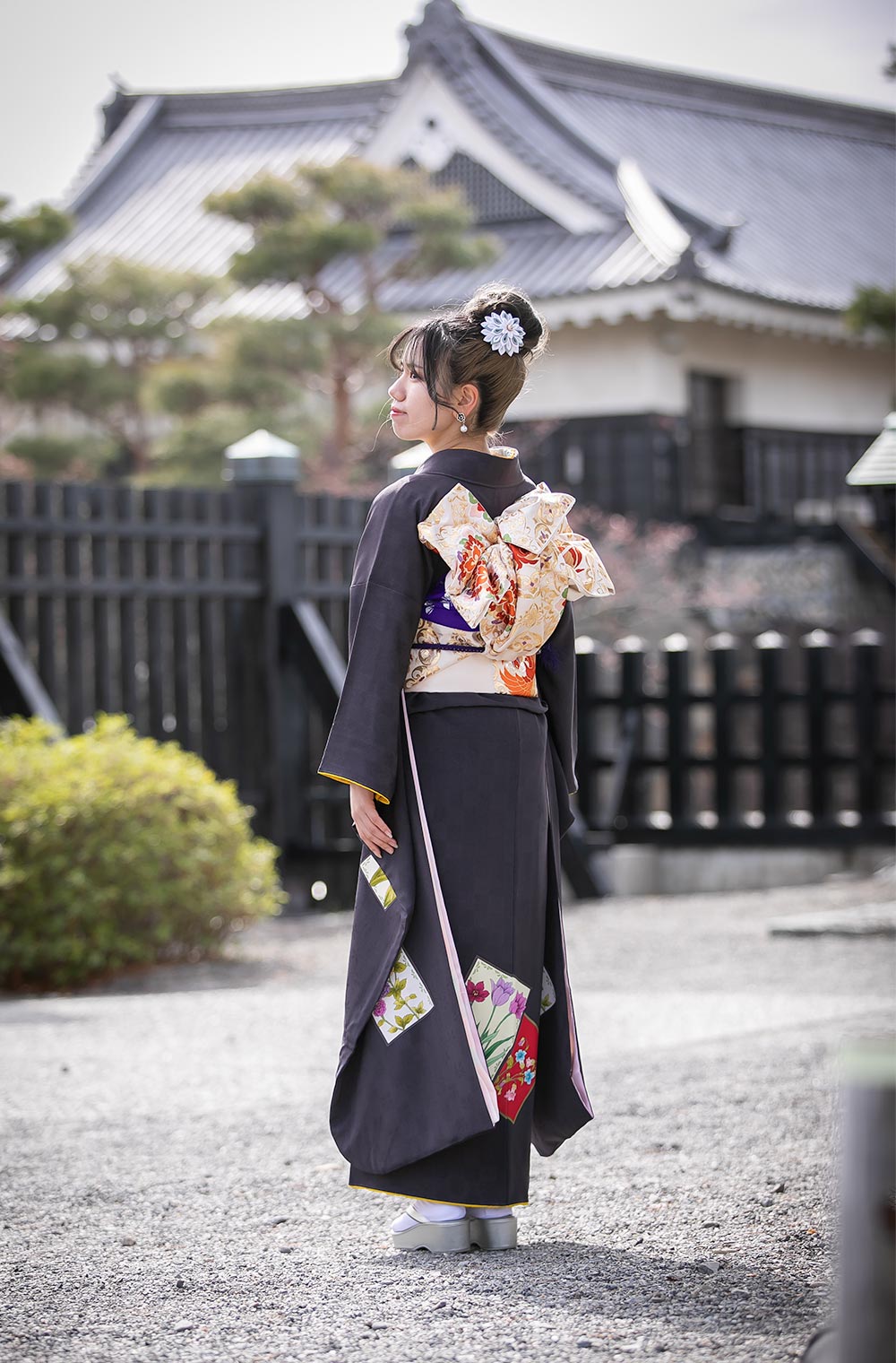 第一印象は地味かと思いきやお嬢さま方から評判の良い花歌留多振袖。 上半身に柄がなく背中に大きな花紋。 帯は全通のハッキリした帯を合わせてみました。 半襟や小物でイメージの変わる大人の振袖です。