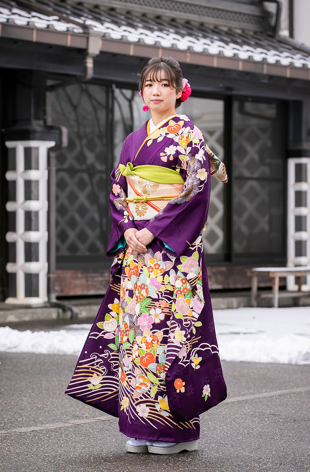 季節の様々な草花に金加工刺繍を施した豪華なお振袖。 柄の一つ一つは可愛らしく、地色は大人っぽい小紫色。 帯はスッキリした西陣織を代表する老舗機屋の唐織袋帯。 古典の真髄、まさにプレミアムな真面目な純日本的な振袖です。