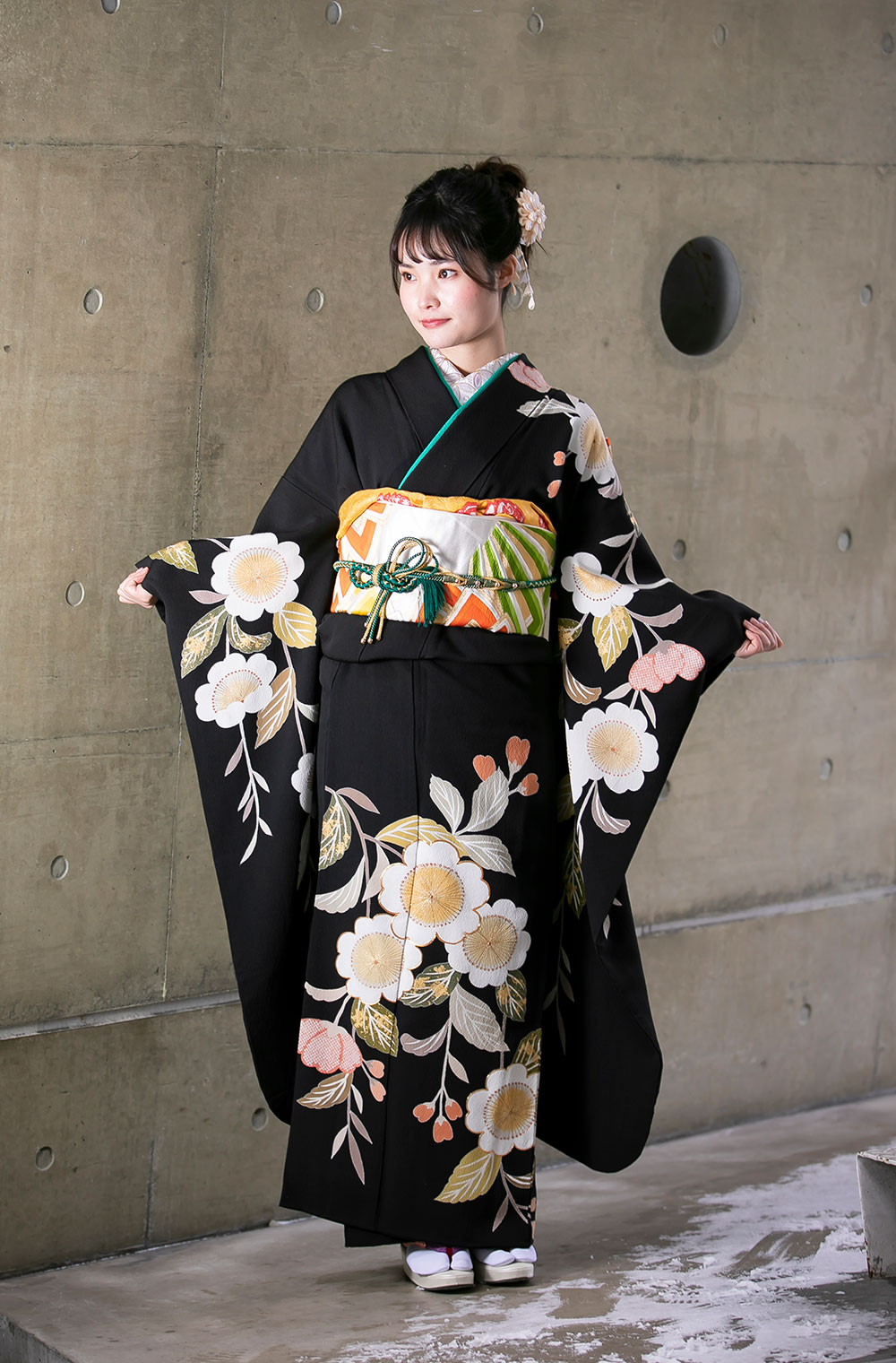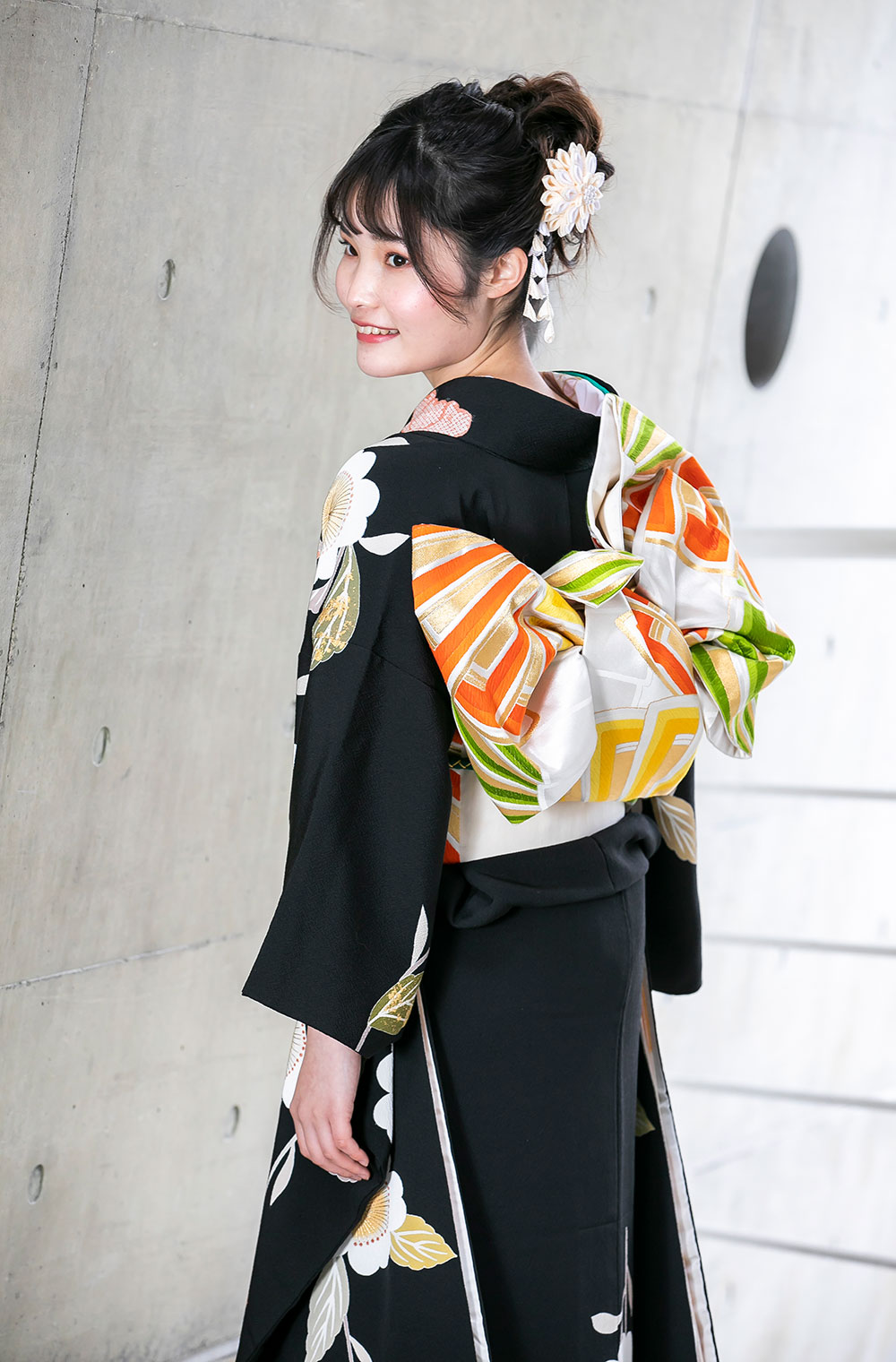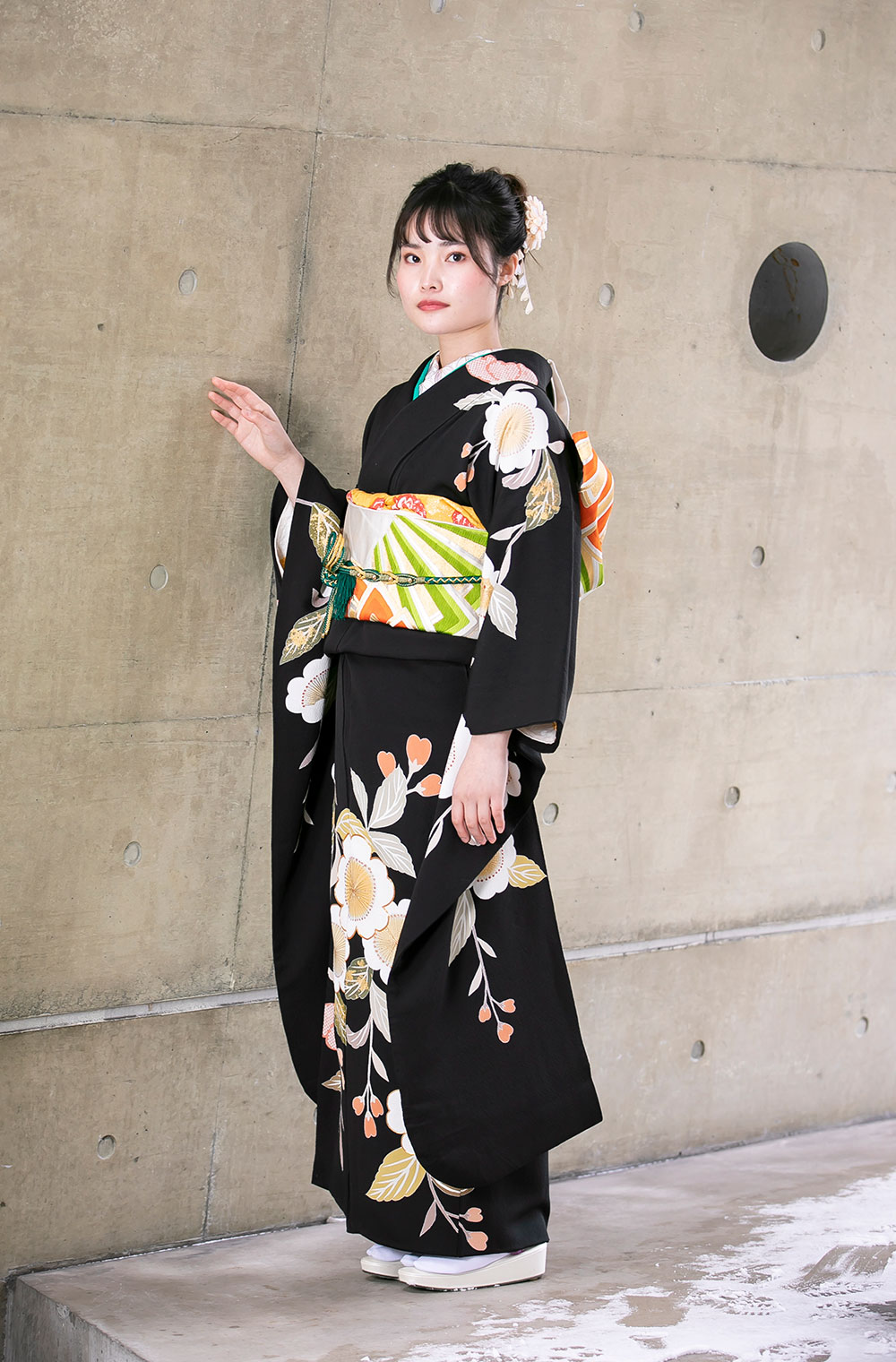 黒地の振袖、購入は出来ないけどレンタルなら着てみたいというお嬢さまのご要望にお応えしました。 オトナ可愛い振袖…結婚式の黒引き振袖としてもお使い頂けるレベルの特撰品です。 袋帯は老舗機屋とみやの白地にスッキリした大柄の扇面袋帯を合わせました。