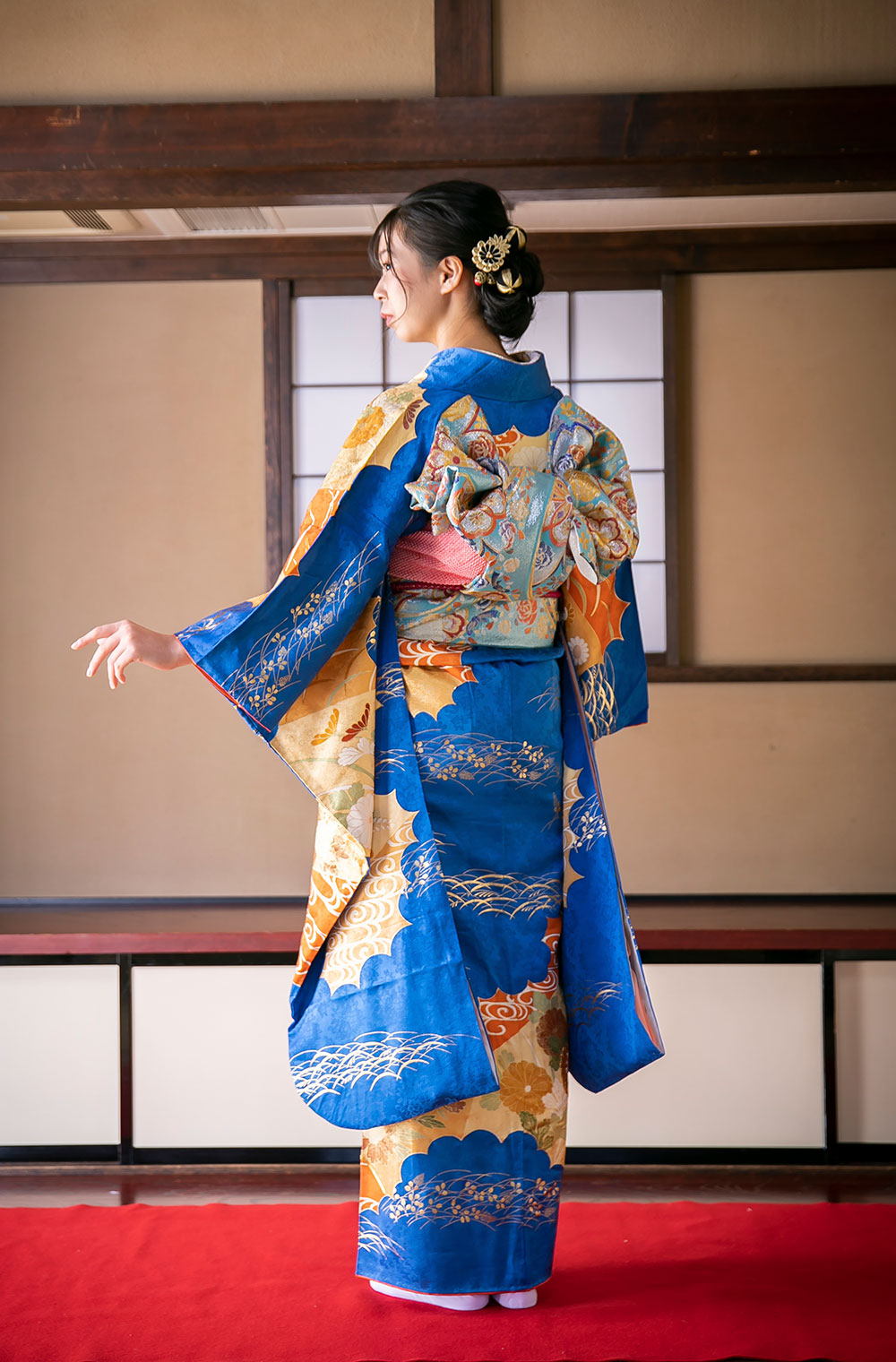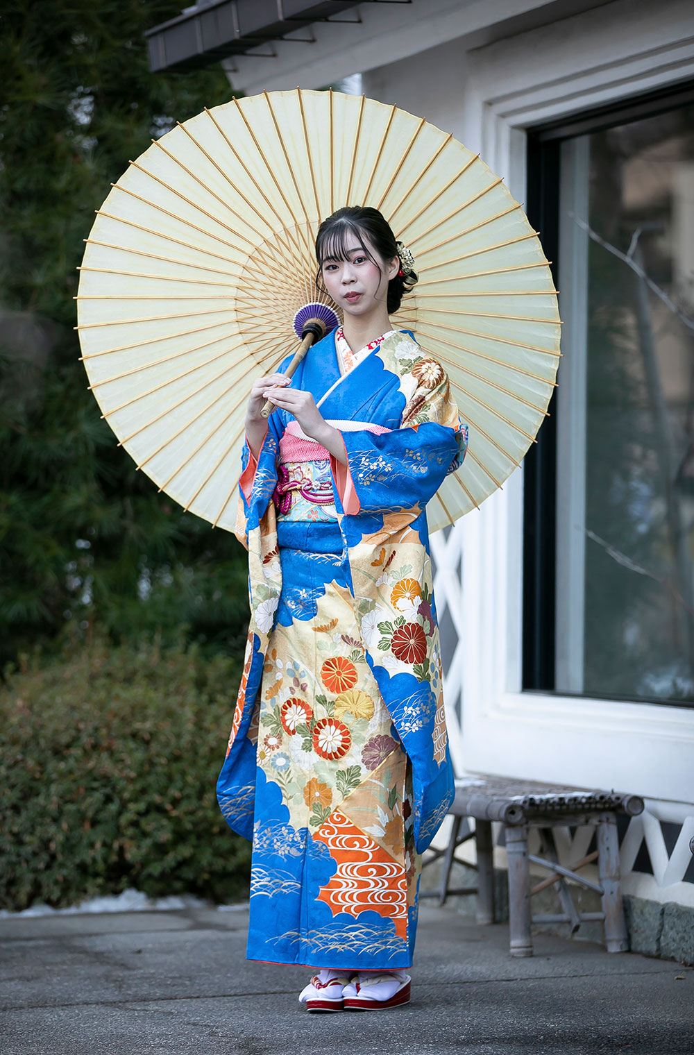 正に青、鮮やかな青をベースに現代の女性を瑞々しく装うこしきゆかしき振袖。 袋帯は振袖を引き立たせる為、薄い水色地に銀糸の可愛らしい帯を合わせてみました。 白赤の切り替え絞り帯揚げが全体をきりりと引き締めています。