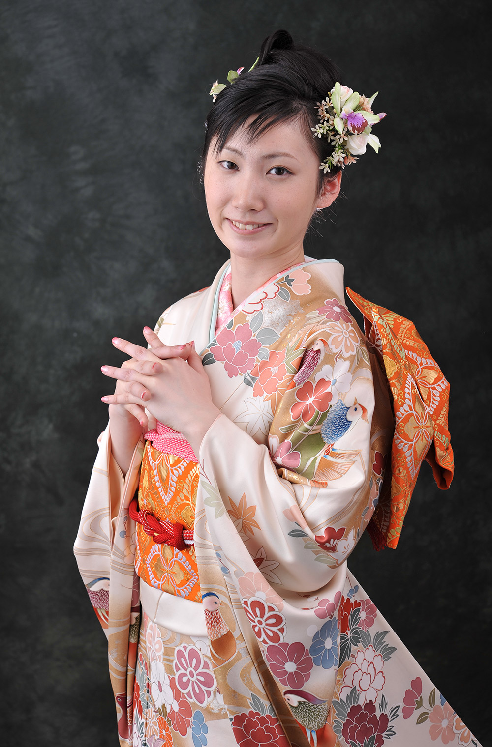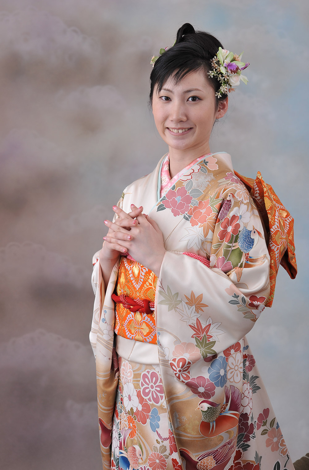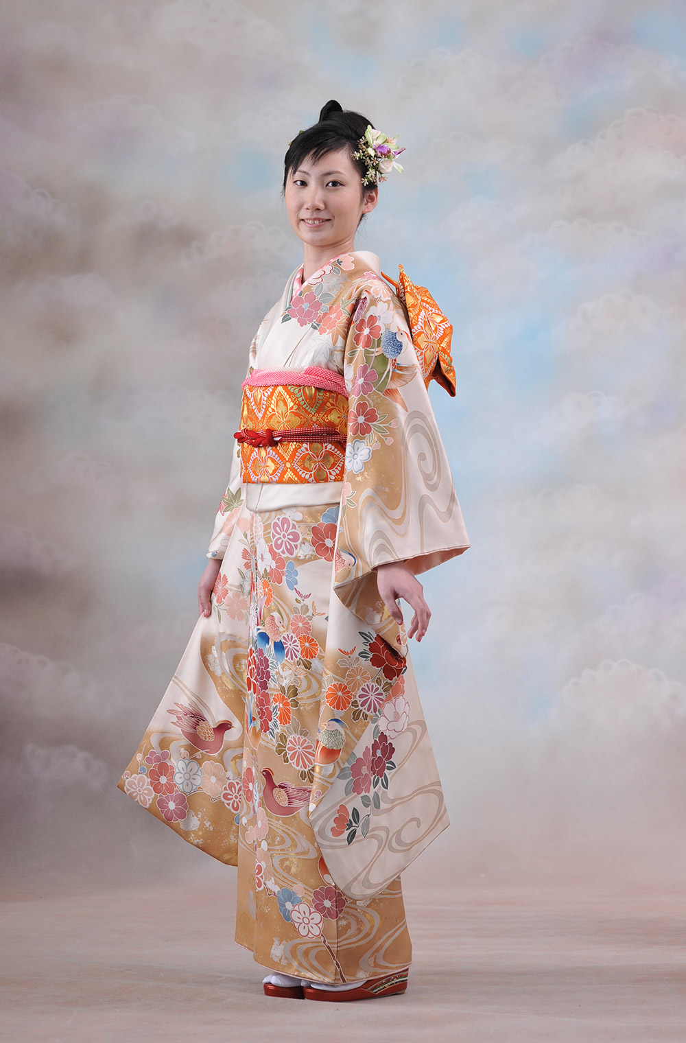 エレガントでクラシカル。特選の京友禅振袖に龍村の帯をコーディネート。 アイボリーの淡い地に、おしどりや四季の草花を描いた、エレガントな京友禅を代表する振袖。 帯には、西陣の機屋を代表する龍村の礼装用唐織帯をコーディネートしました。 エレガントでクラシカルな装いを。