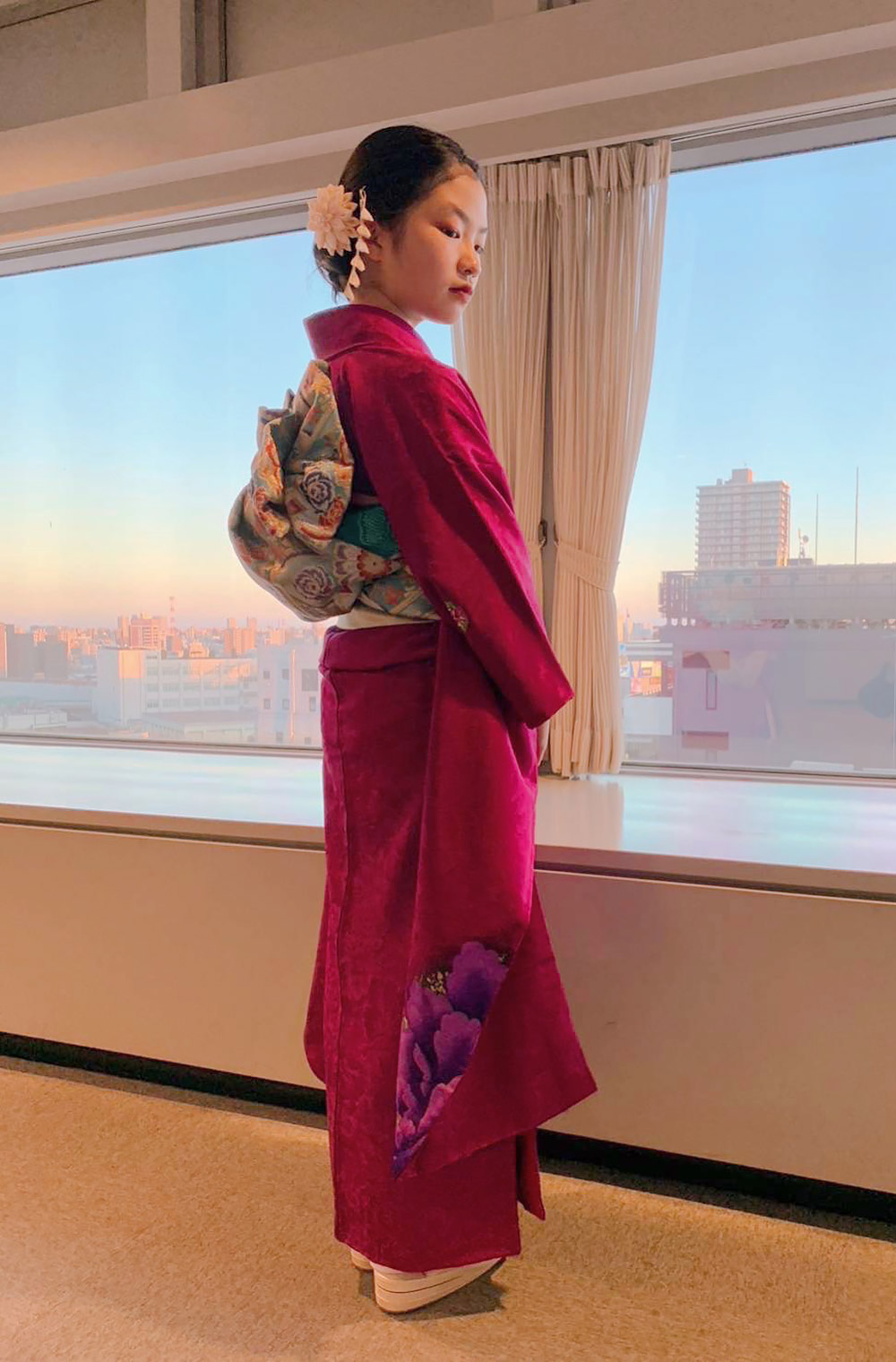 152cm以下のお嬢様におすすめします。人気のスッキリ赤紫地振袖に袖と裾に大きな華模様。 袖丈、裄、共にSサイズ対応となっており可愛らしくなり過ぎ無いよう、顔周りが無地場ですので大人っぽいお振袖です。 Sサイズのお嬢様に好評です。Sサイズの袴にもお使いいただけます。