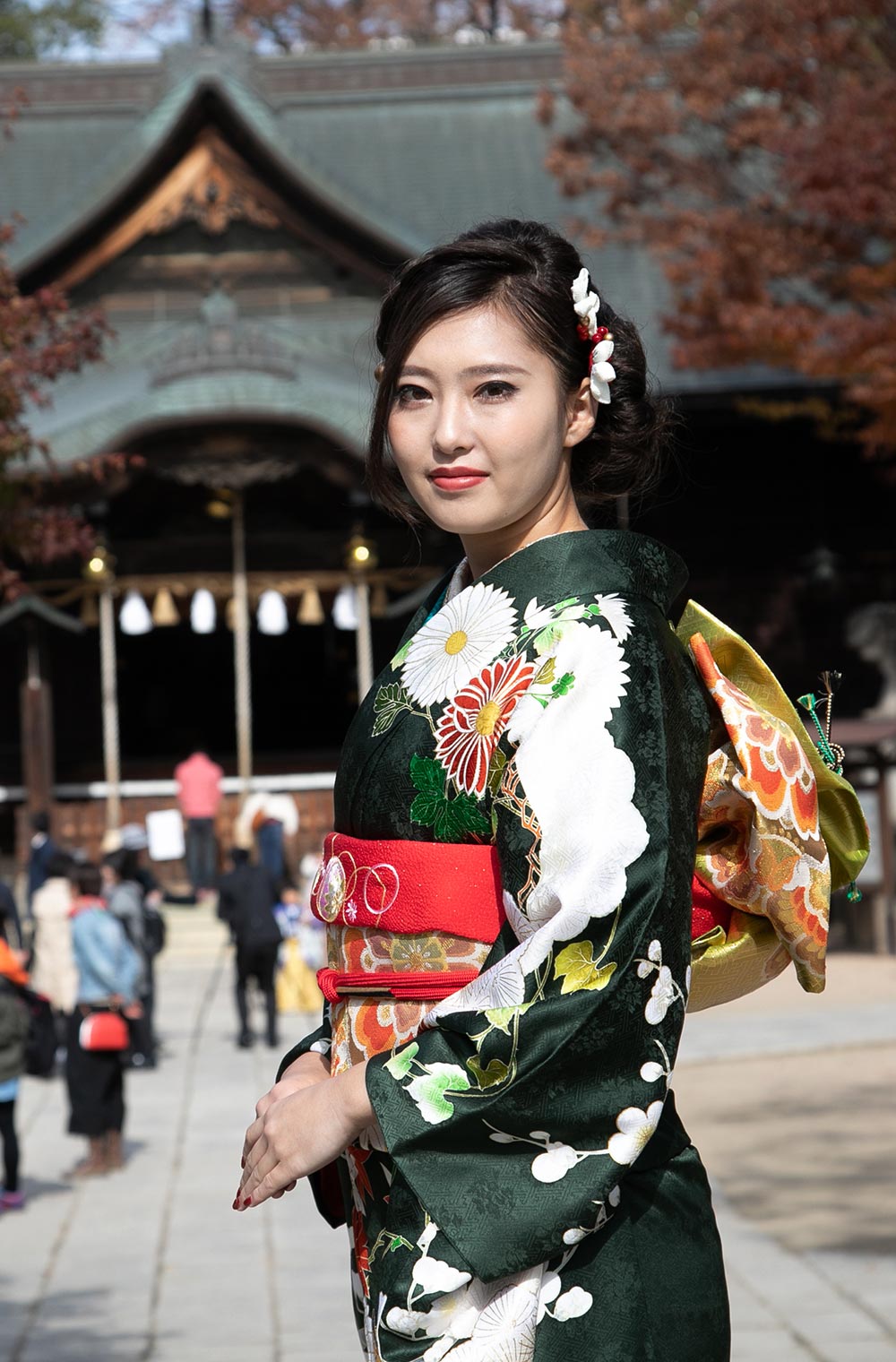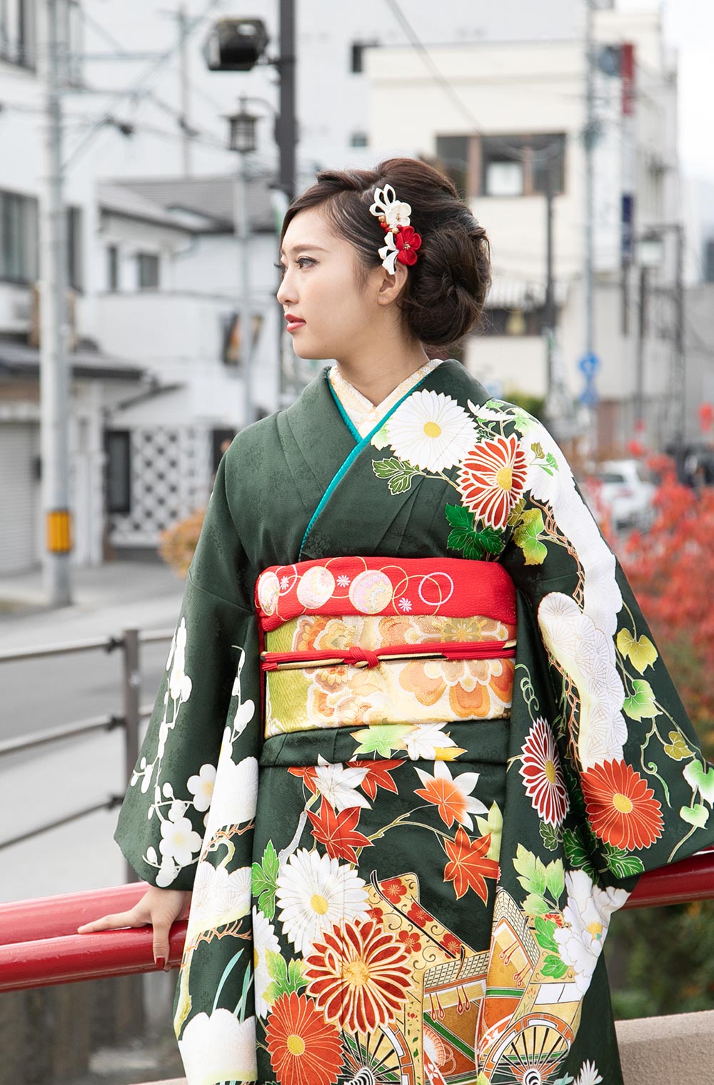 深緑の中に高い技術の白場加工、上前には贅沢な金刺繍で四季折々の草花を大胆に意匠した豪華な振袖。 袋帯は振袖に負けないよう、本引箔で有名な西陣梅垣織物の三丁箔の帯。 草履バッグ、帯締め帯揚げは着物雑誌などでもお馴染みの衿秀さんの小物を合わせてあります。 身長158㎝から170㎝の高身長のお嬢さまにお勧めします