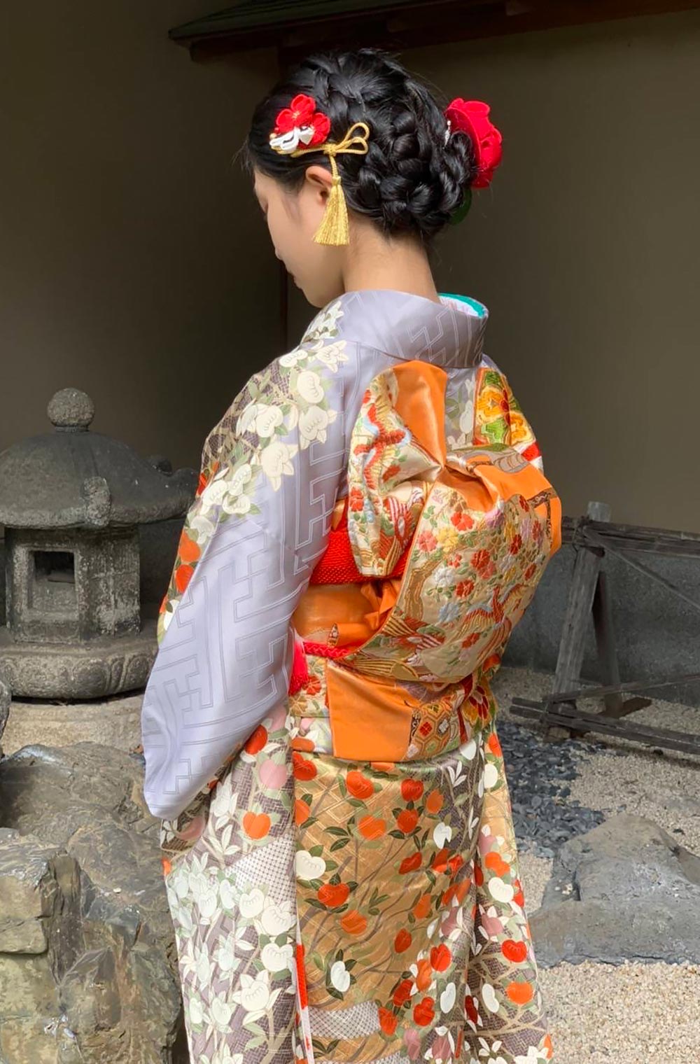 大きめの紗綾型の地紋生地に小付けの橘の流れるような上前。なんと言っても特選品ならではの落ち着いた箔使が素敵な振袖です。小さめ(Sサイズ)152センチ以下の方におすすめします。 袋帯は全体を可愛らしくするために同色の橙色の唐織振袖専用帯をあわせ、 ちりめん無地赤の帯締め帯揚とヘアースタイルでレトロ感いっぱいにしてみました。 長襦袢は橙色と白の飛び絞りを。