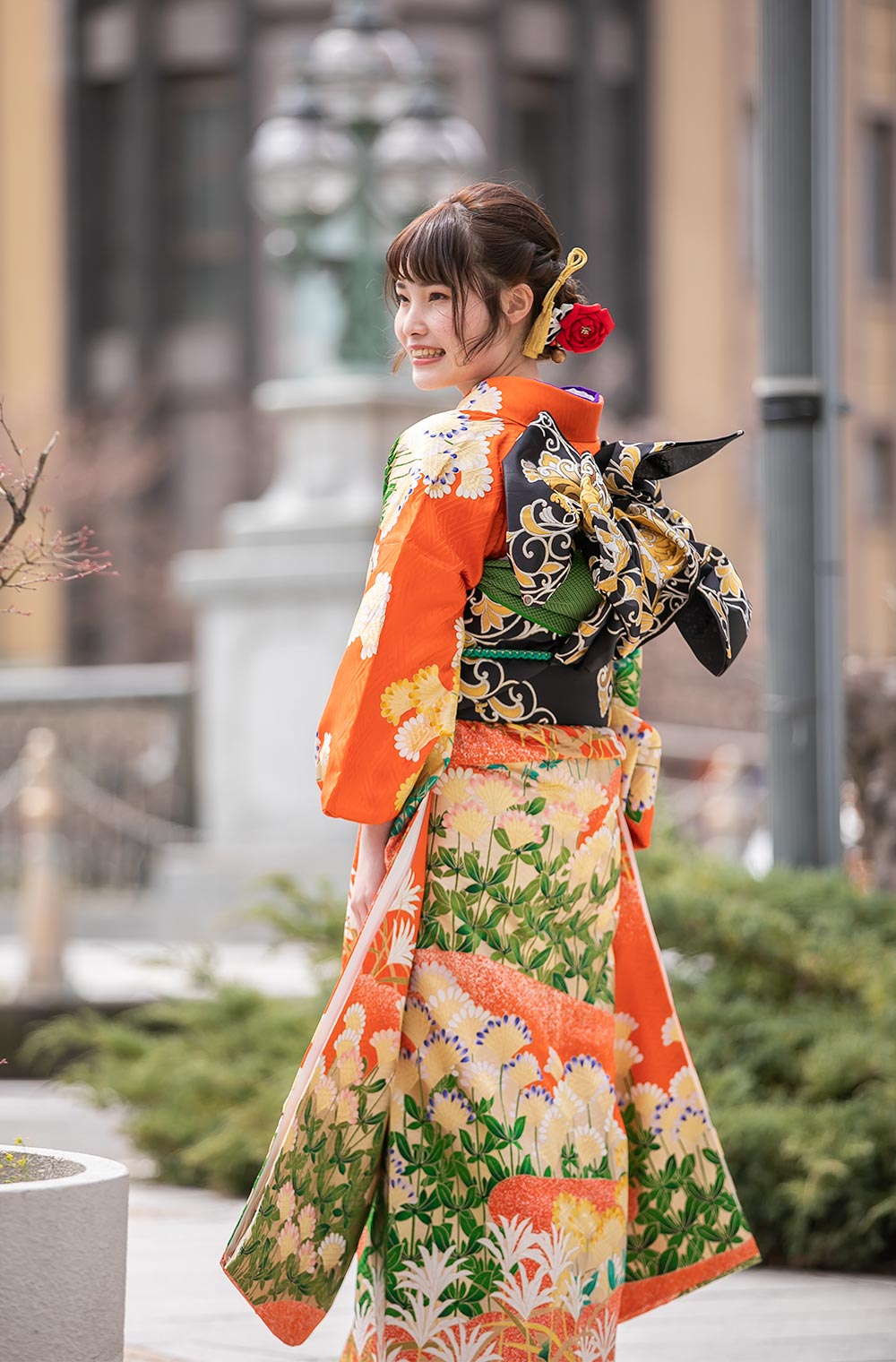 かつて花嫁衣装にお振袖を着た時代がありました。 緞子風の朱赤の生地に絢爛を競った金練り加工。 唯一無二の個性的で豪華な振袖をお探しのお嬢さまにお勧めいたします。 帯は西陣となみの金唐草更紗袋帯を使用。