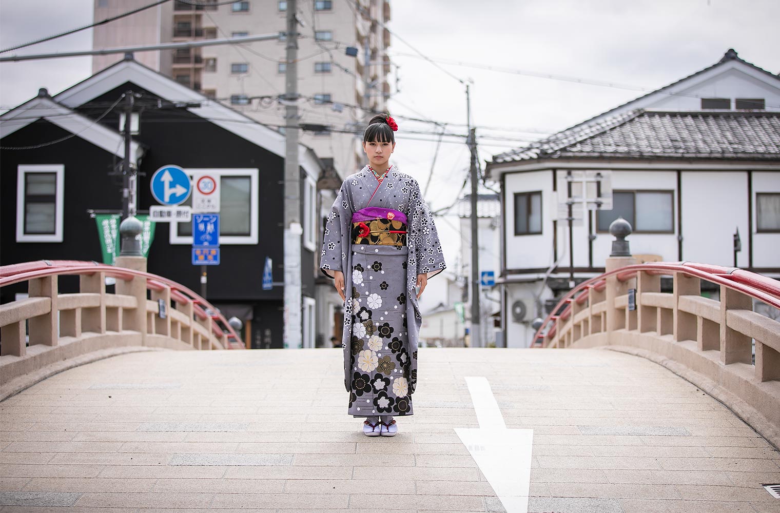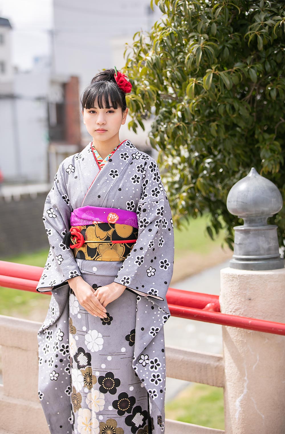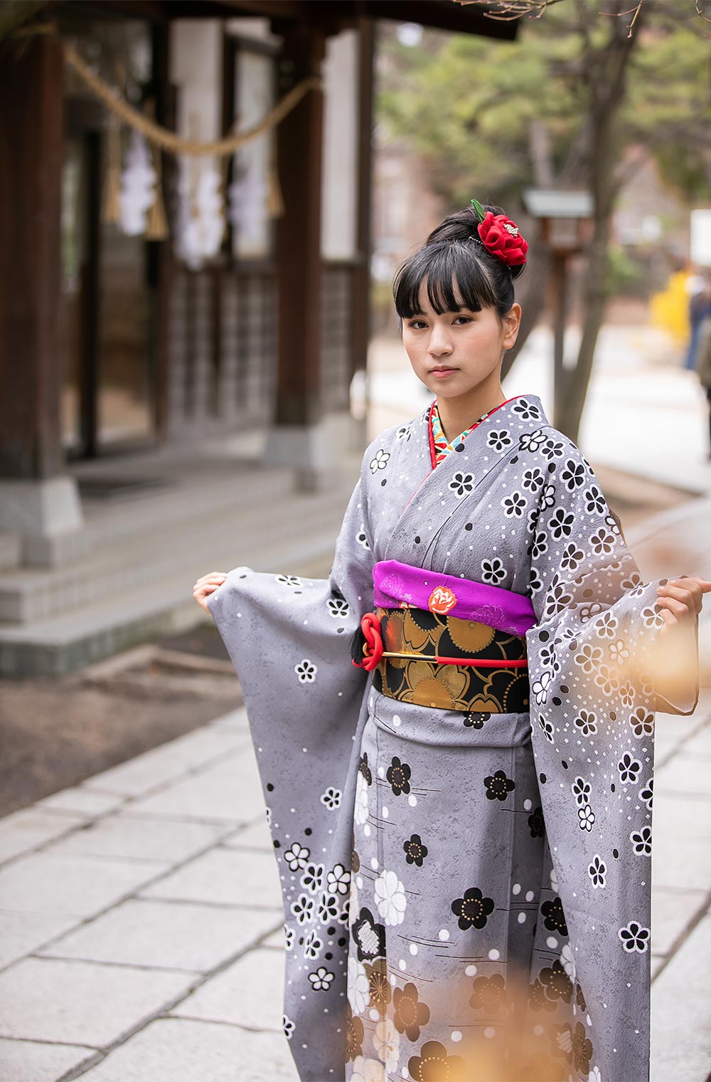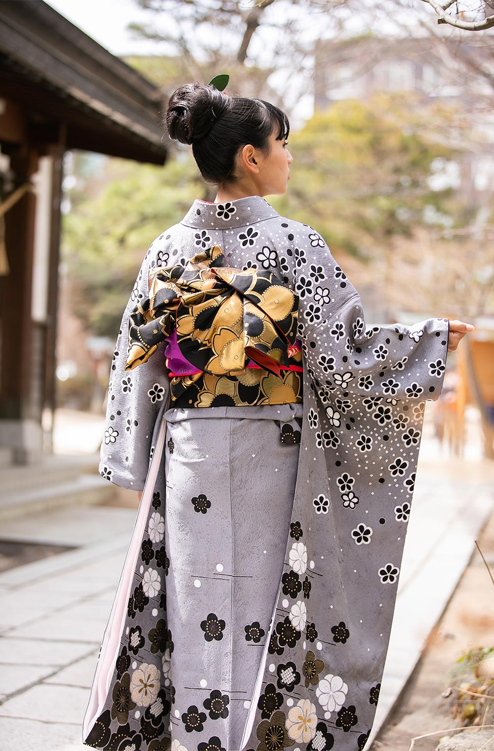 京都の小さな染屋さんからお譲り頂いた、グレー縮緬梅ちらし。 お嬢さま方から人気、評価が非常に高く現代風の振袖ですので、帯もあえて黒金のワントーンコーデにしました。 半襟は衿秀さんのカラフルな麻の葉で、差し色に紫と赤を添えて…