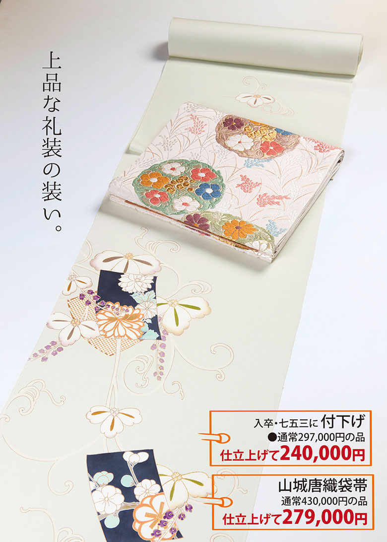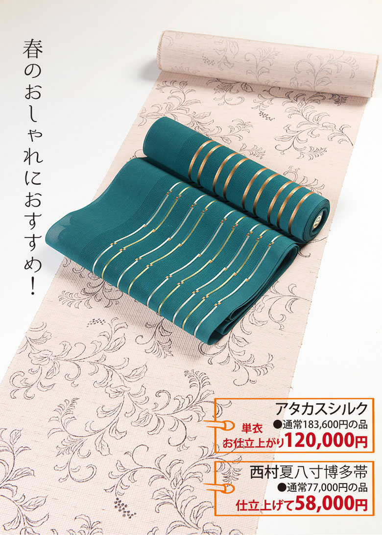 春の礼装からお洒落きものやお洒落帯、そして小物まで、 若女将が京都、東京・日本橋で仕入れた新商品を、うきうきプライスでご紹介いたします。
